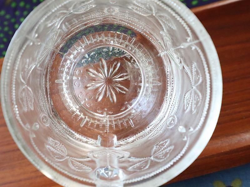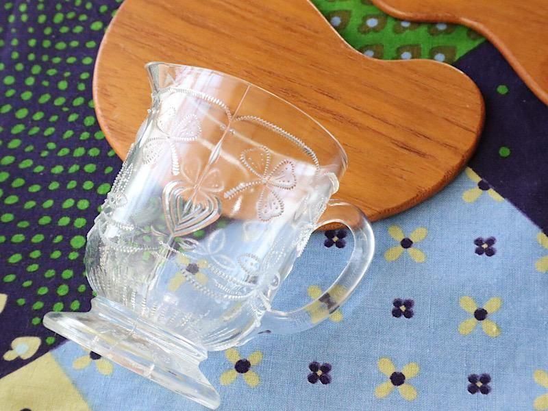 重厚感のあるガラスの表面に、凹凸のクローバーの模様が施された可愛らしいデザイン、脚付きのデザインになります。